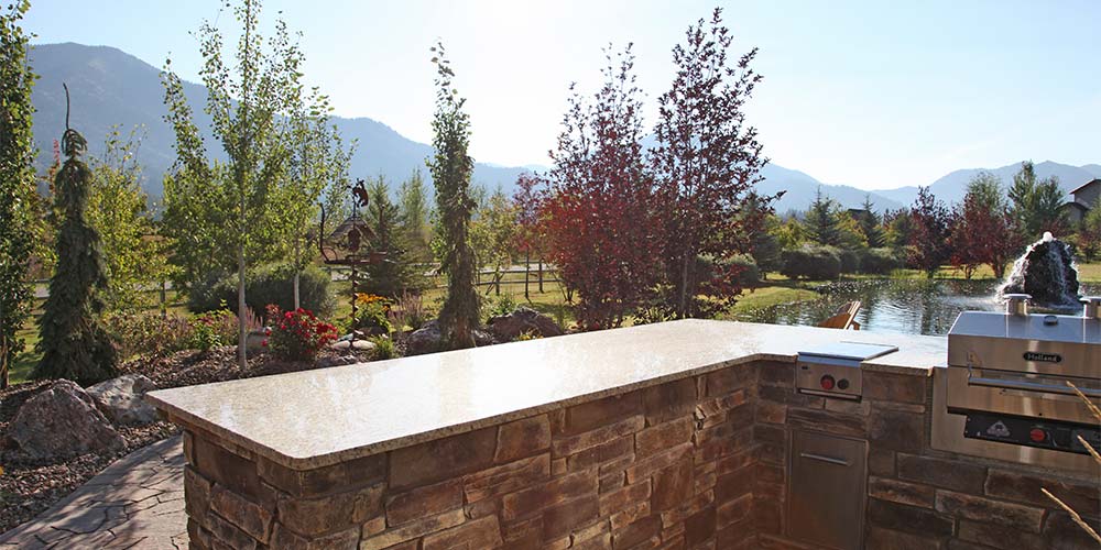 • Stacked quartzite on fireplace and kitchen backsplash